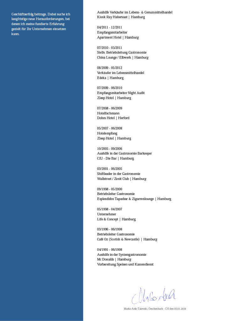 Zwischendurch war ich stets in der Gastronomie tätig, wo ich insbesondere ein feines Gespür für zwischenmenschliche Verhaltensweisen, Teamdynamik sowie den professionellen Umgang mit unterschiedlichen Charakteren entwickeln konnte. Diese Erfahrungen haben mein Verständnis für Menschenführung und situationsgerechtes Handeln nachhaltig geprägt.