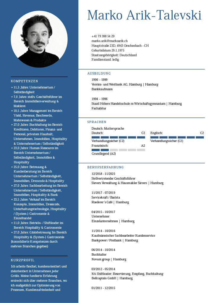 Mein Curriculum Vitae spiegelt die Vielfalt meiner beruflichen Erfahrungen wider – von unternehmerischer Selbständigkeit über Management- und Führungsaufgaben bis hin zu spezialisierter Expertise in den Bereichen Buchhaltung, Immobilienverwaltung und Human Resources. Er steht für einen konsequenten Werdegang, geprägt von Engagement, Lösungsorientierung und Integrität